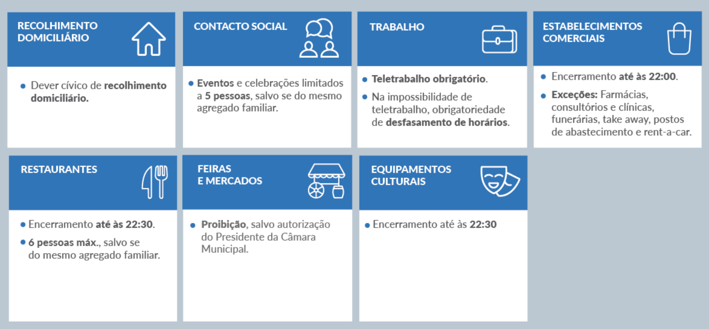 - Eventos e celebrações limitados a 5 pessoas, salvo se do mesmo agregado familiar