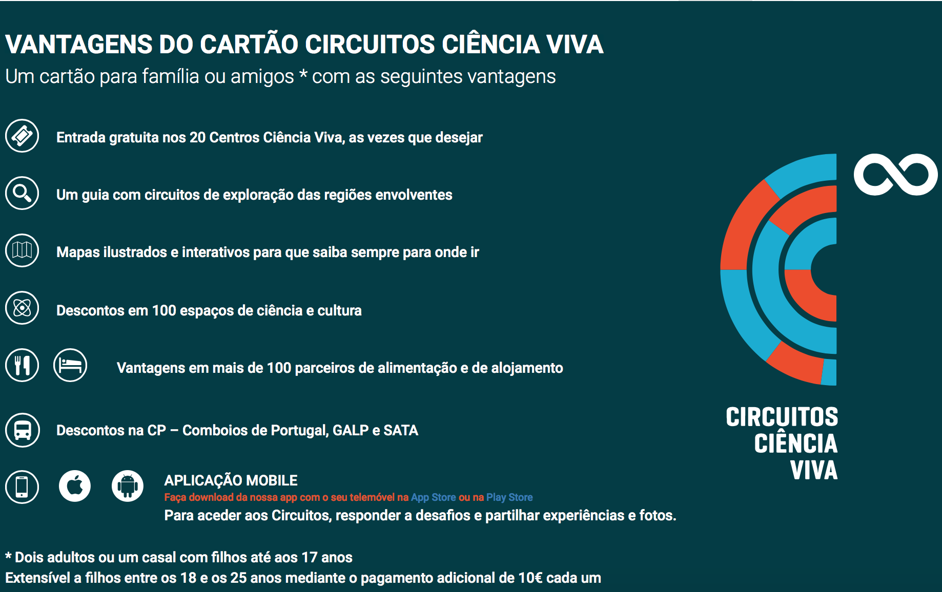 Durante um ano, com um cartão, um guia e uma app, pode visitar gratuitamente os 20 Centros Ciência Viva, as vezes que quiser, e usufruir de vantagens em mais de 200 parceiros de todo o país.